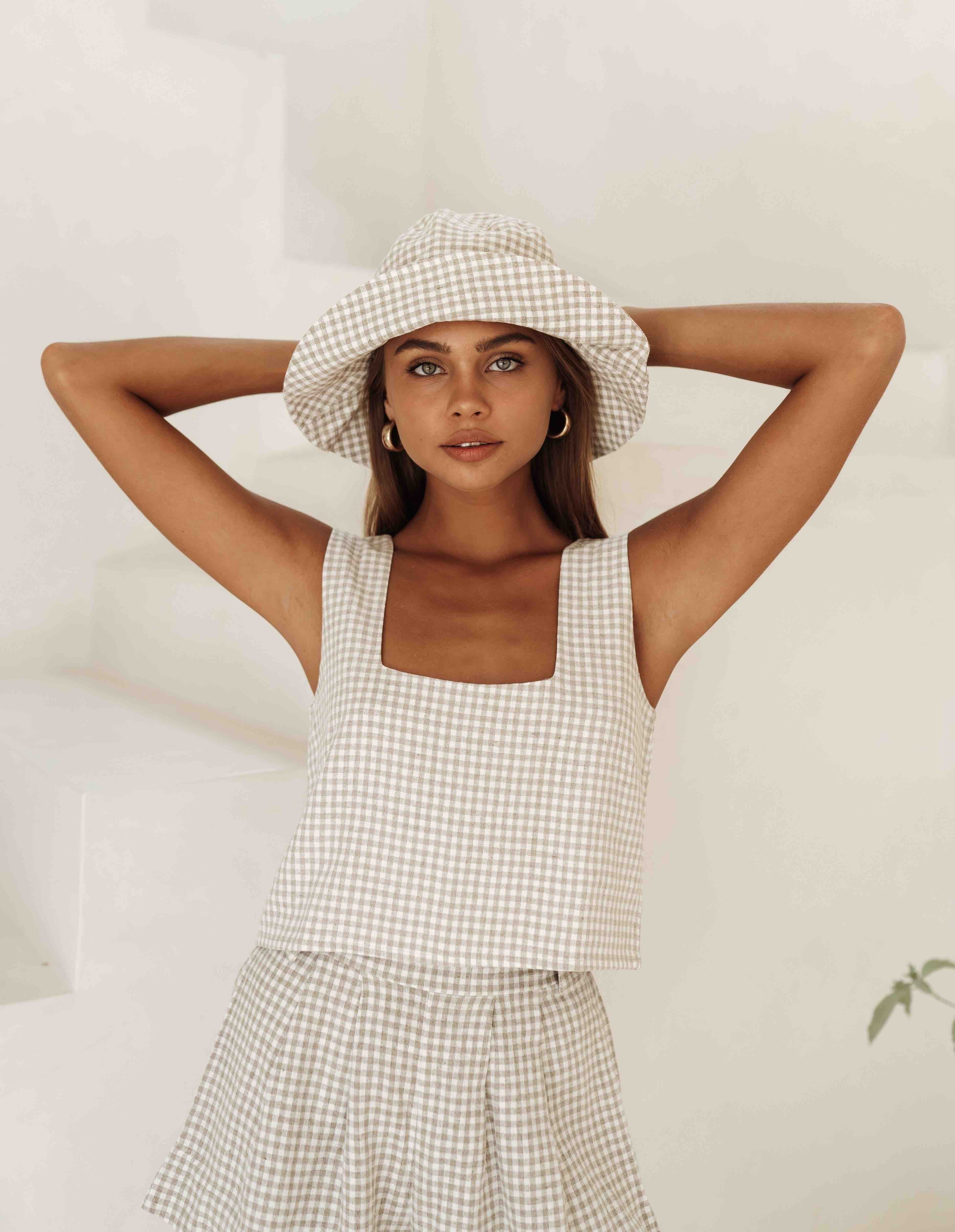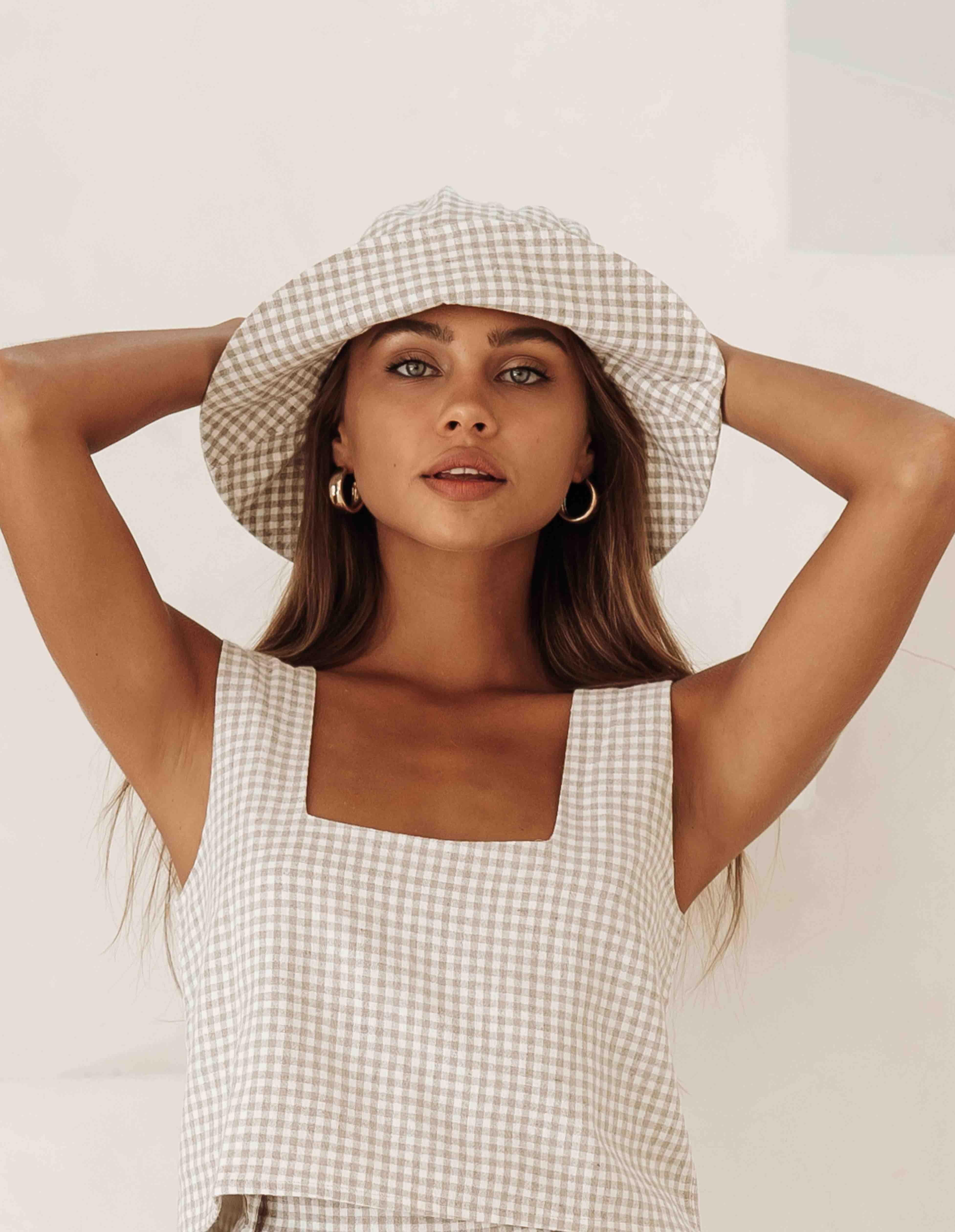 The Meno Bucket Hat, handmade in our signature gingham fabric, is a must-have for sunny summer days. Guaranteed to liven up any look from the beach to brunch we expect you're going to live in it.
